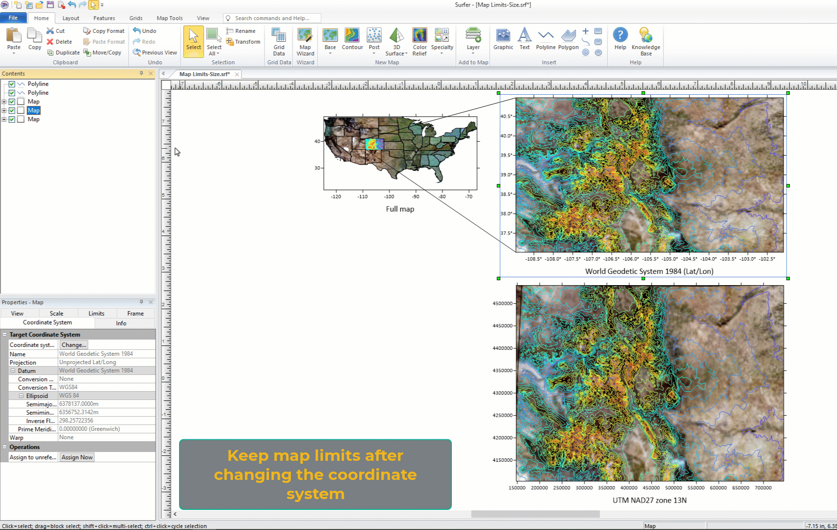 Converting the coordinate system of a map just got easier! Any changes you have made to the map size and limits are now retained after changing the coordinate system, no matter what projection you choose.