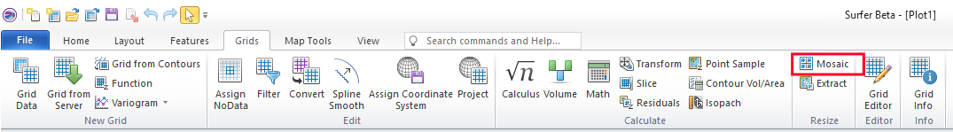 To resolve this we can combine the grids using the Grid Mosaic command. The Grid Mosaic command combines two or more input grids of the same coordinate system into a single output grid. To mosaic any set of grids click Grids | Resize | Mosaic.