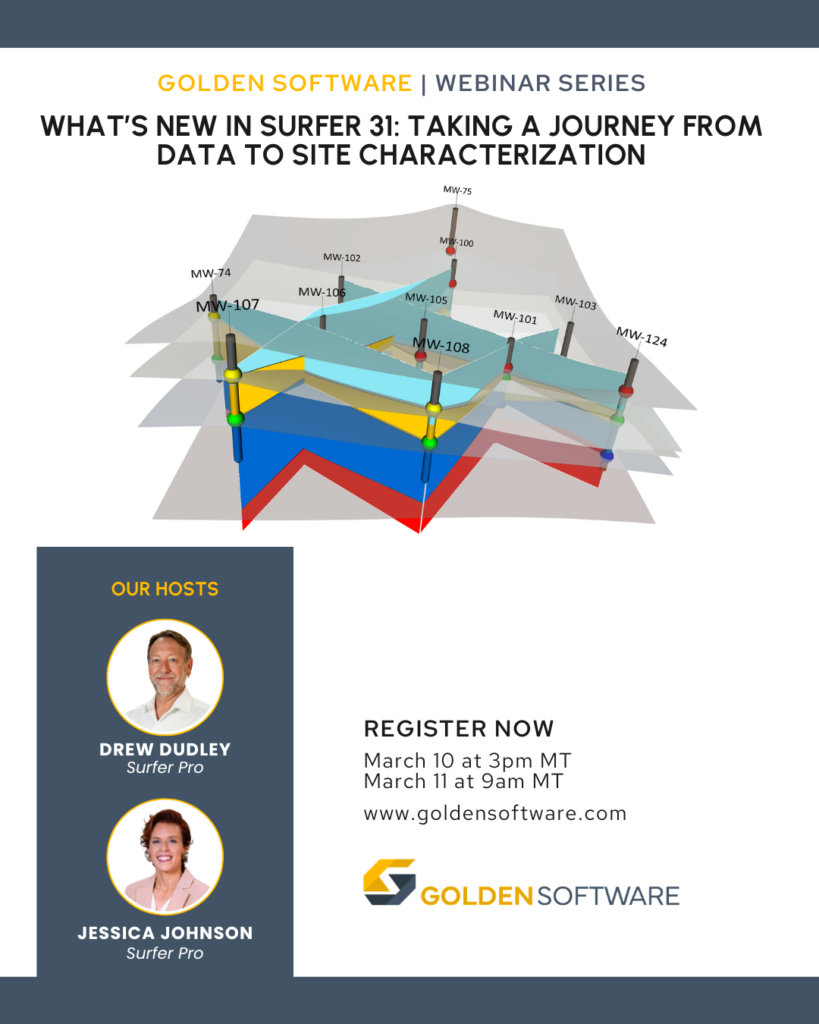 Join us for an exclusive webinar hosted by Golden Software showcasing the latest features and functionality available in Surfer 31. Surfer Pro Drew Dudley will demonstrate how the newly released tools can be used to perform a complete site characterization using a combination of drillhole, geochemical, and hydrological data.