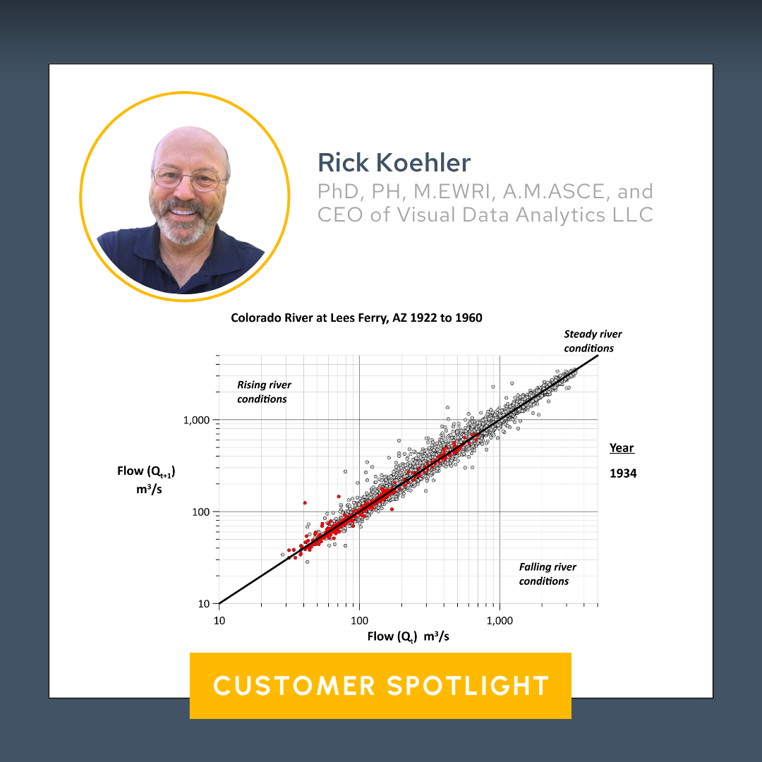 That’s where Grapher’s data filter features step in to save the day. They equip you to dynamically sort and visualize data, saving time and delivering deeper insights along the way. One person who understands these features well is Rick Koehler, PhD, PH, M.EWRI, A.M.ASCE, and CEO of Visual Data Analytics LLC. He regularly works with large hydrologic time series datasets but has seamlessly integrated Grapher’s filtering into his workflow to quicken his analysis and visualization process. What used to take days now takes minutes—and that’s not an exaggeration.