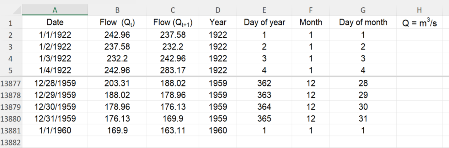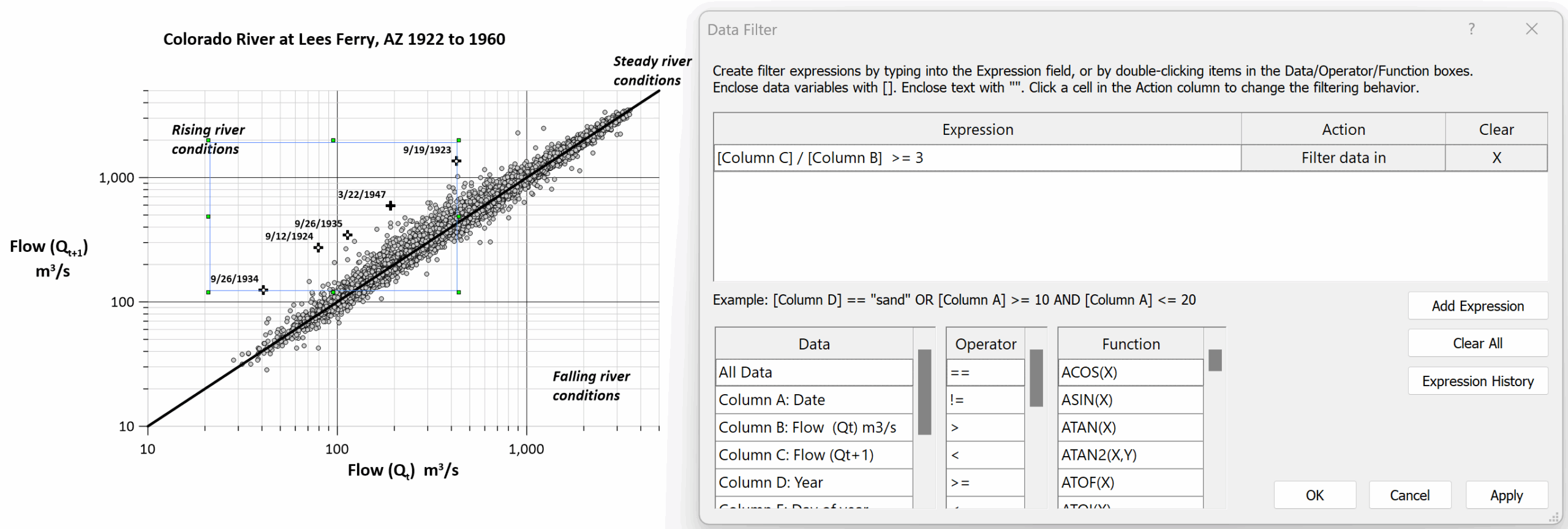 Column C is the next-day flow, and Column B is the current-day flow. This filter uses data properties that are already in Rick’s dataset. Then, using the label variable tool, Rick simply adds dates directly to the plot—making it instantly clear when and how often these events occurred over nearly four decades of streamflow records.