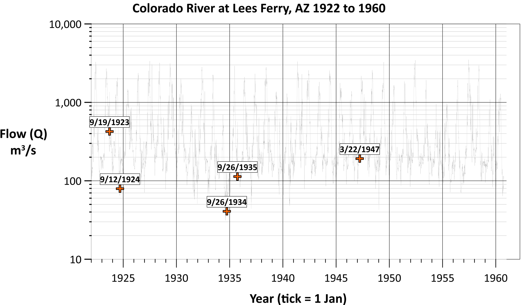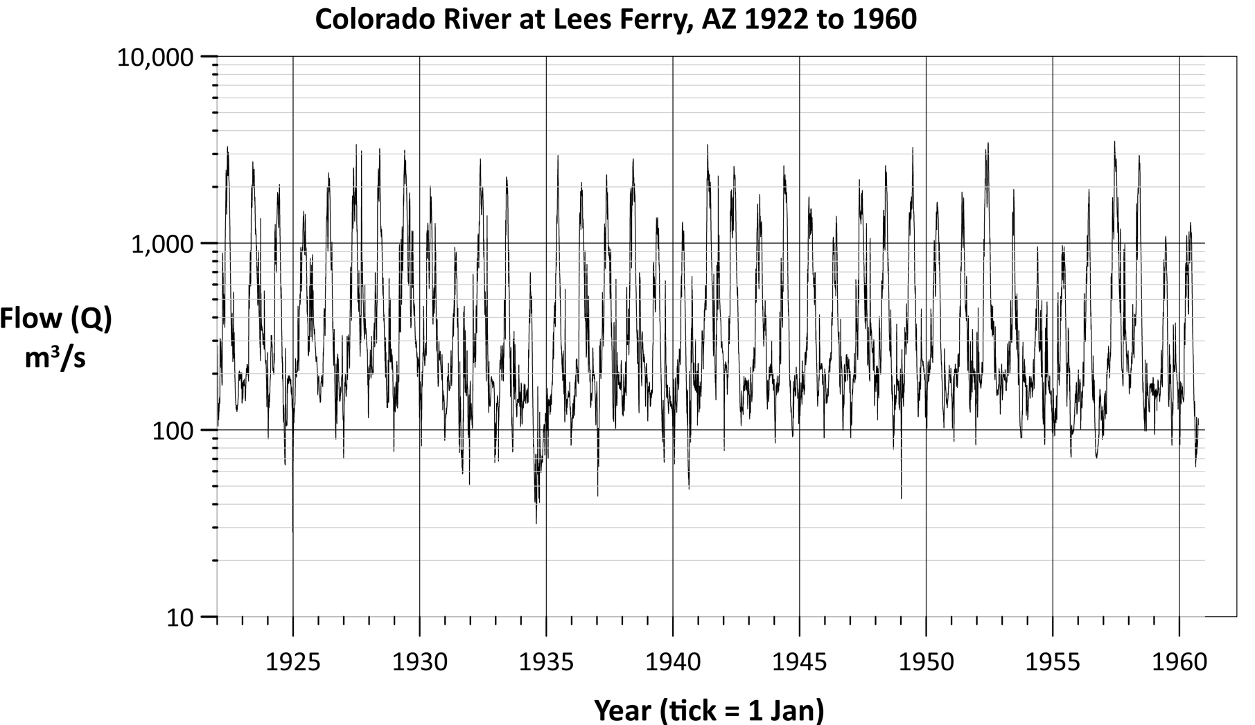 This is a traditional hydrograph showing water flow at the Colorado River at Lees Ferry, Arizona.