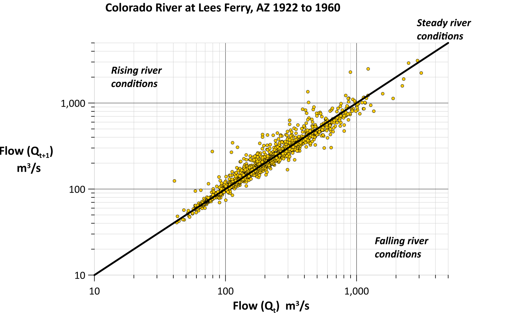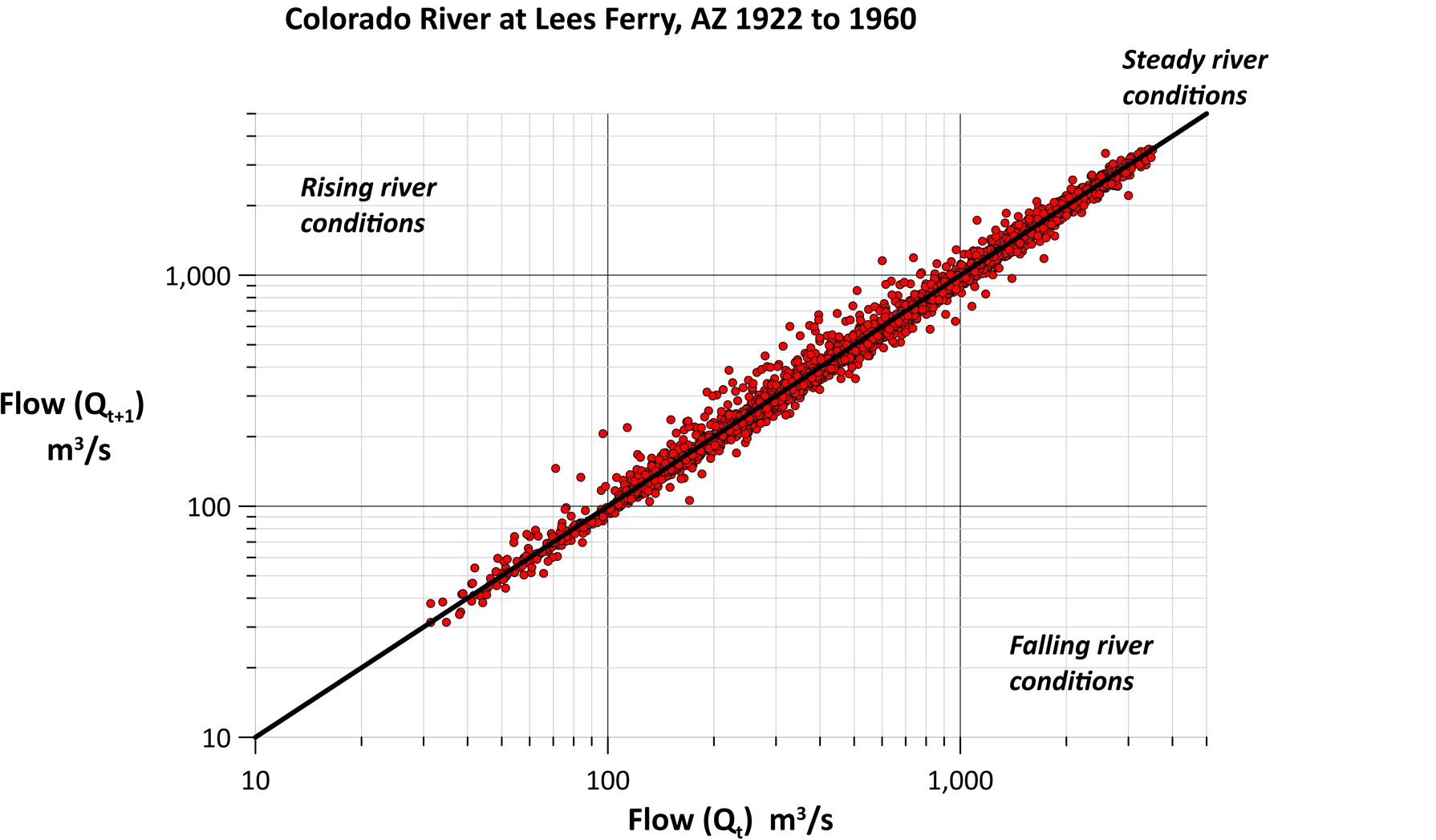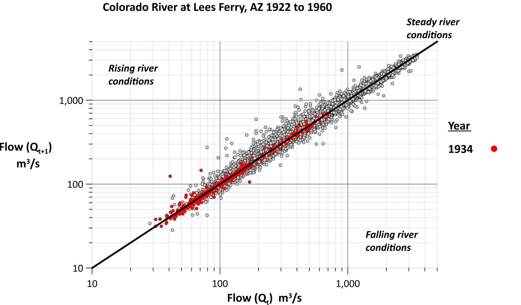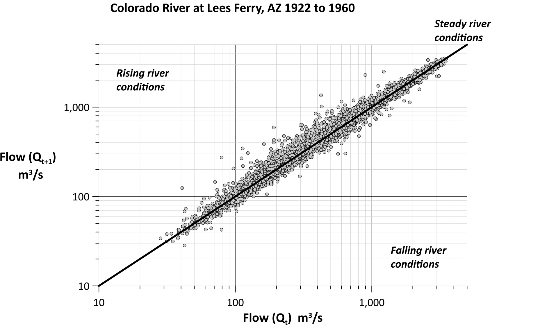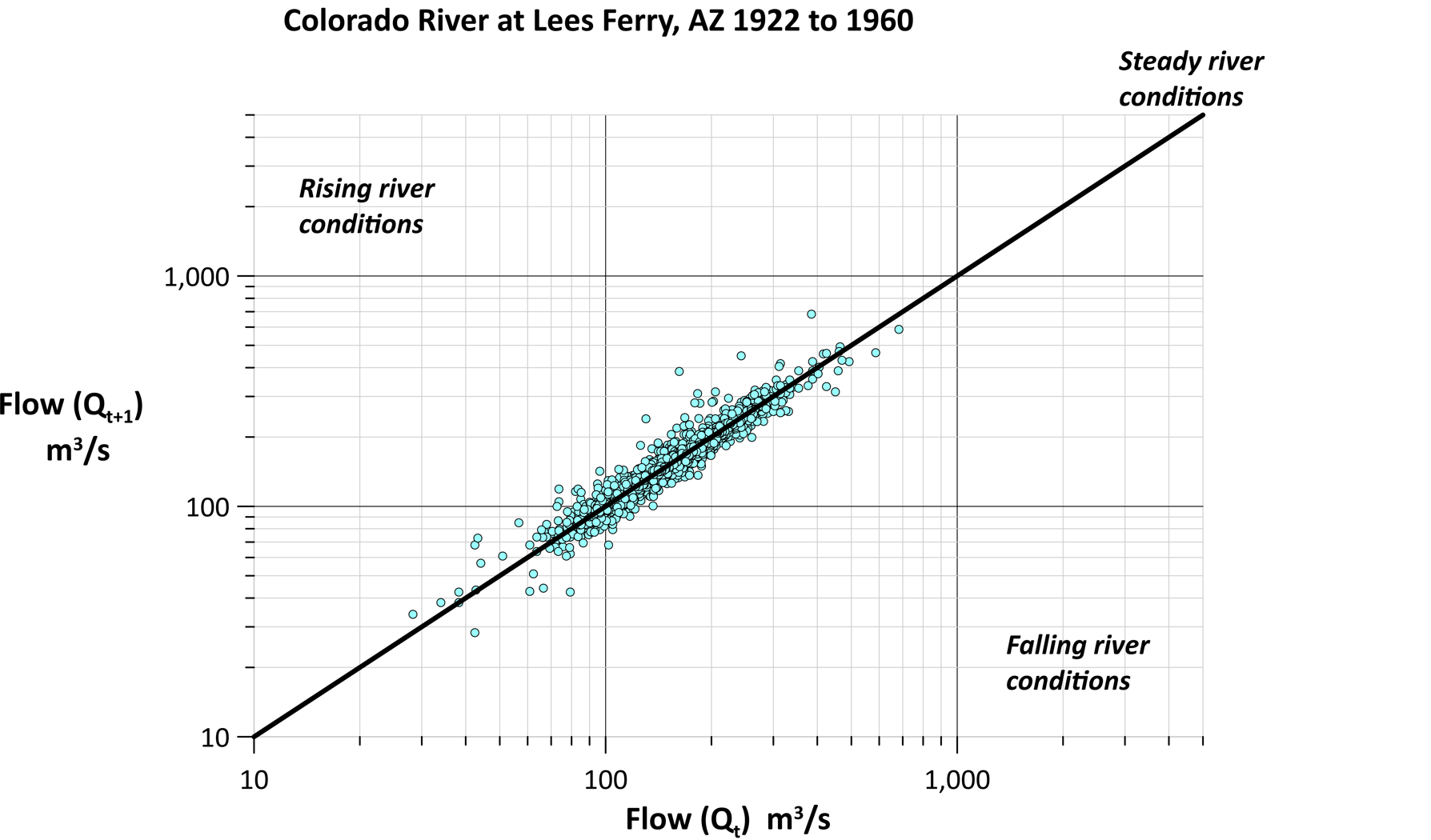 “This line shows when the river has the same flow from one day to the next, meaning those data points will fall onto that line,” Rick explained. “If the next day’s river flow is greater than the current day, my points will plot above that line. Likewise, if the next day’s river flow is less than the current day’s flow, those points will plot below the line.”