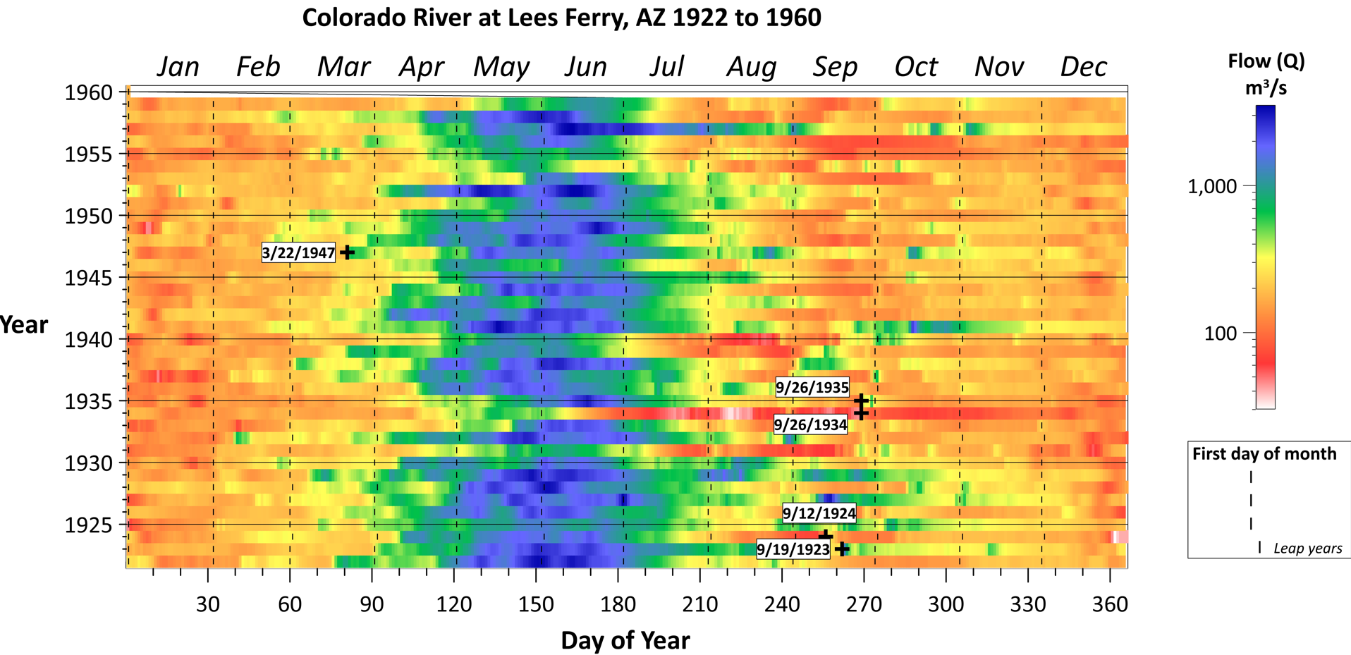 For this visual, the X-axis is the day of the year, and the Y-axis is the year. Data points are assigned colors based on the flow level. Another layer shows the first day of each month.