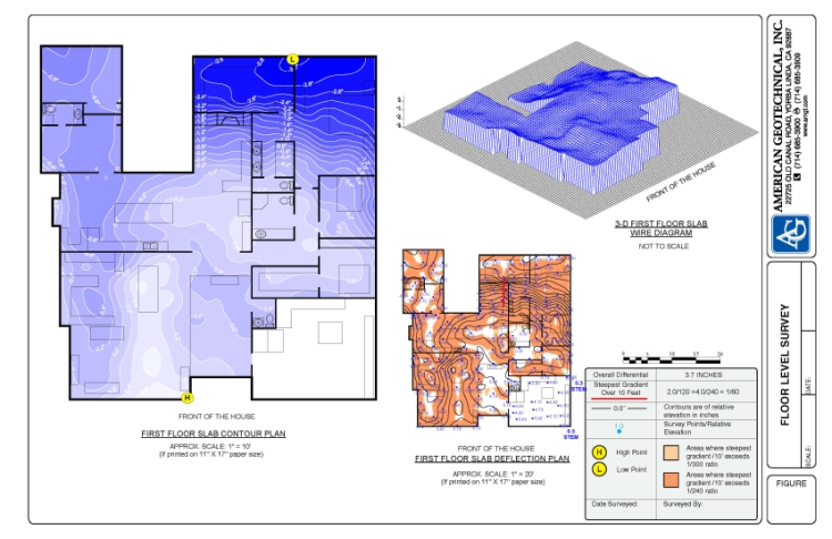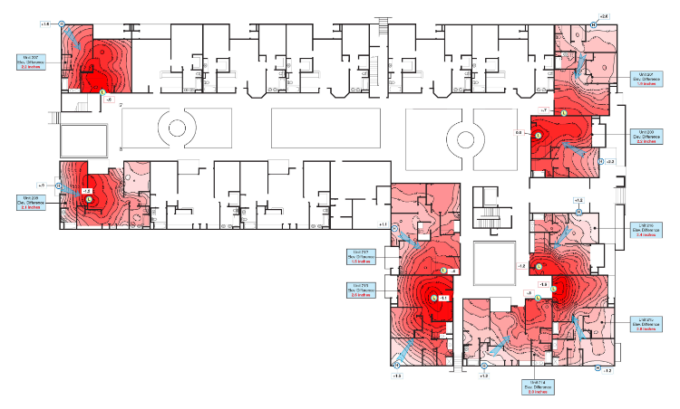 The typical first step is for geotechnical engineers to capture relative elevation measurements, called deflections, across the slab using a simple water level. Even for a standard-size home, the technician may collect 100 or more measurements. The goal is to determine a baseline elevation for the slab and then convert the other values to plus or minus numbers depending on whether they are above or below the average.