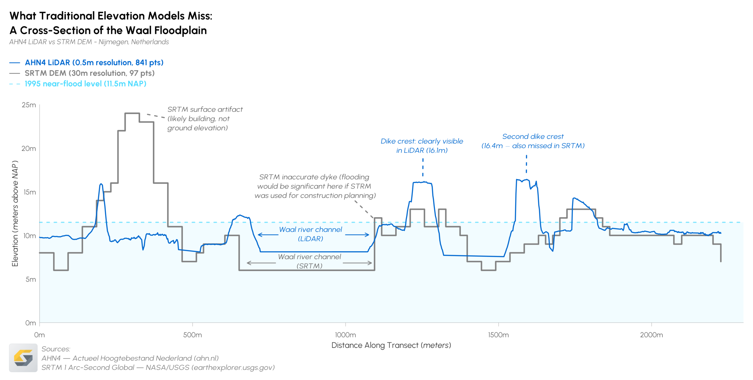 These fine-scale height differences matter enormously. A shift of just a few centimeters can determine whether water overtops a road, breaches a defended area, fills a retention basin, or diverts into a populated neighborhood. In low-lying regions—especially across the Dutch river delta, where gradients are shallow, and water seeks any available path—the impact of those subtle elevation variations is amplified.