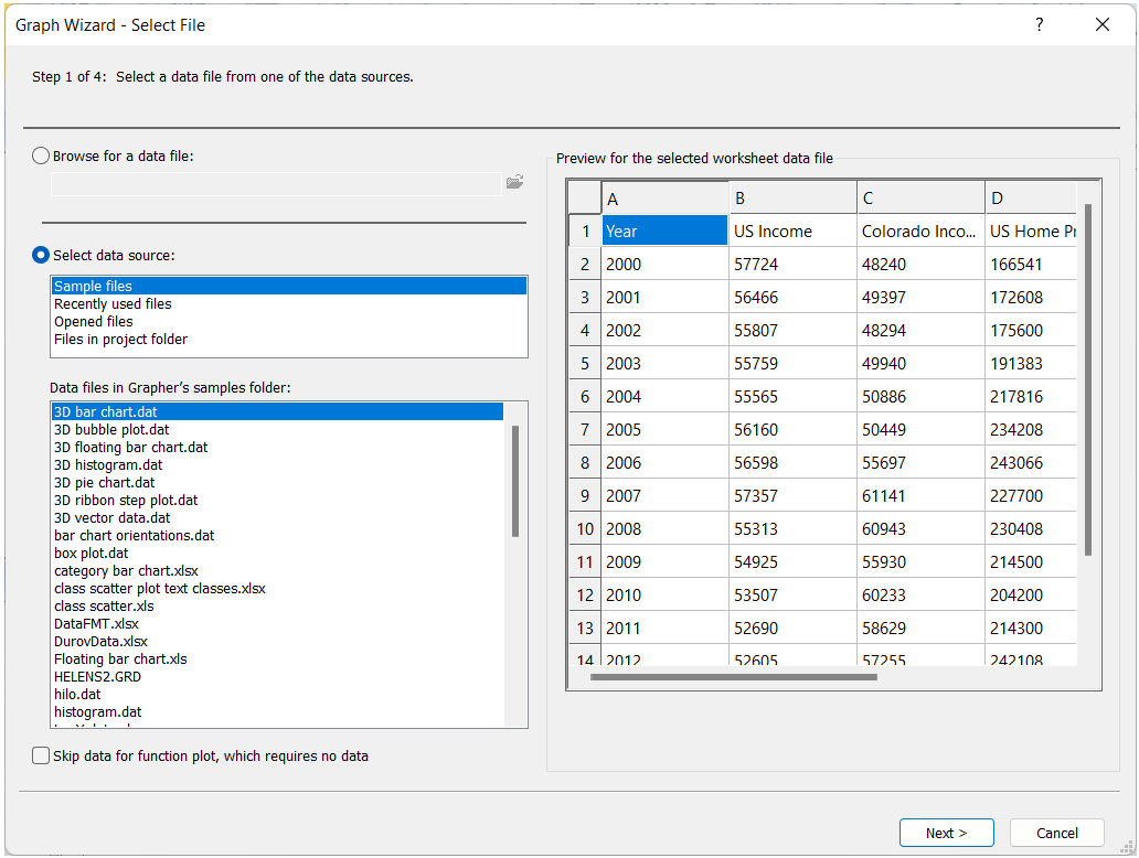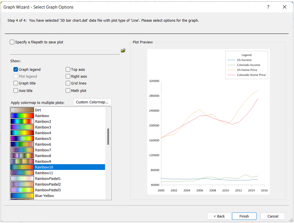 When using it, the Graph Wizard will guide you through choosing your data file, selecting the right plot type, and picking visual elements like colors, labels, and legends—all in one place. It makes your design process incredibly easy because it gives you a simple workflow to ensure you can create and finish a polished output quickly.